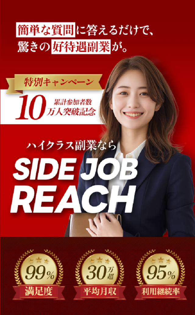 スマホで簡単に“スキマ時間だけ”で高収入!?…と思ったら、実は手が出せない“怪しい副業”だった──。今回は、話題の副業案件 サイドジョブリーチ(SIDE JOB REACH)を、丁寧に・分かりやすく“怪しい”ポイント全部見せします!
